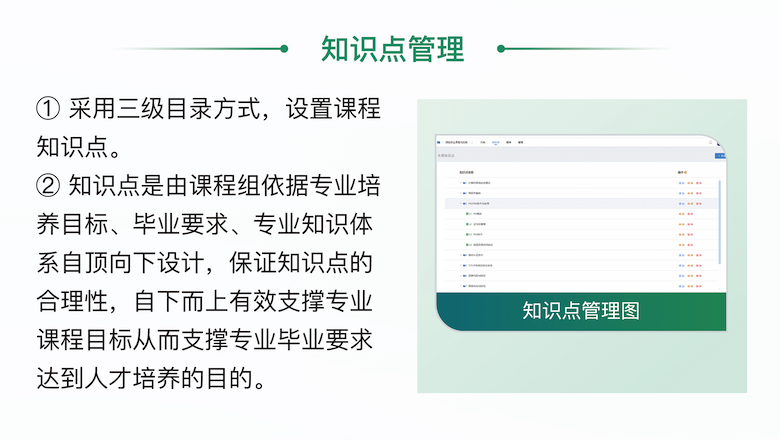 将课程内容化解为知识点,同时为知识点添加课程目标支撑、难易程度、课程时长等属性,形成基于知识点的课程内容知识树,支持基于知识点及课程目标的统计分析,主要包括课程多级知识点的录入、修改、批量导入、拖动编辑等功能,在修订大纲时课程知识点能够自动导入大纲的教学内容中,教师可根据各专业的课程目标对知识点进行定制。