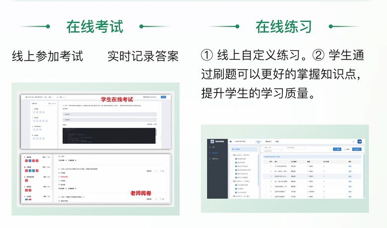 利用智能组卷的自动组卷模式自动生成试卷,在支持线上答题、练习的基础上,增设在线监考、防作弊等常用功能。