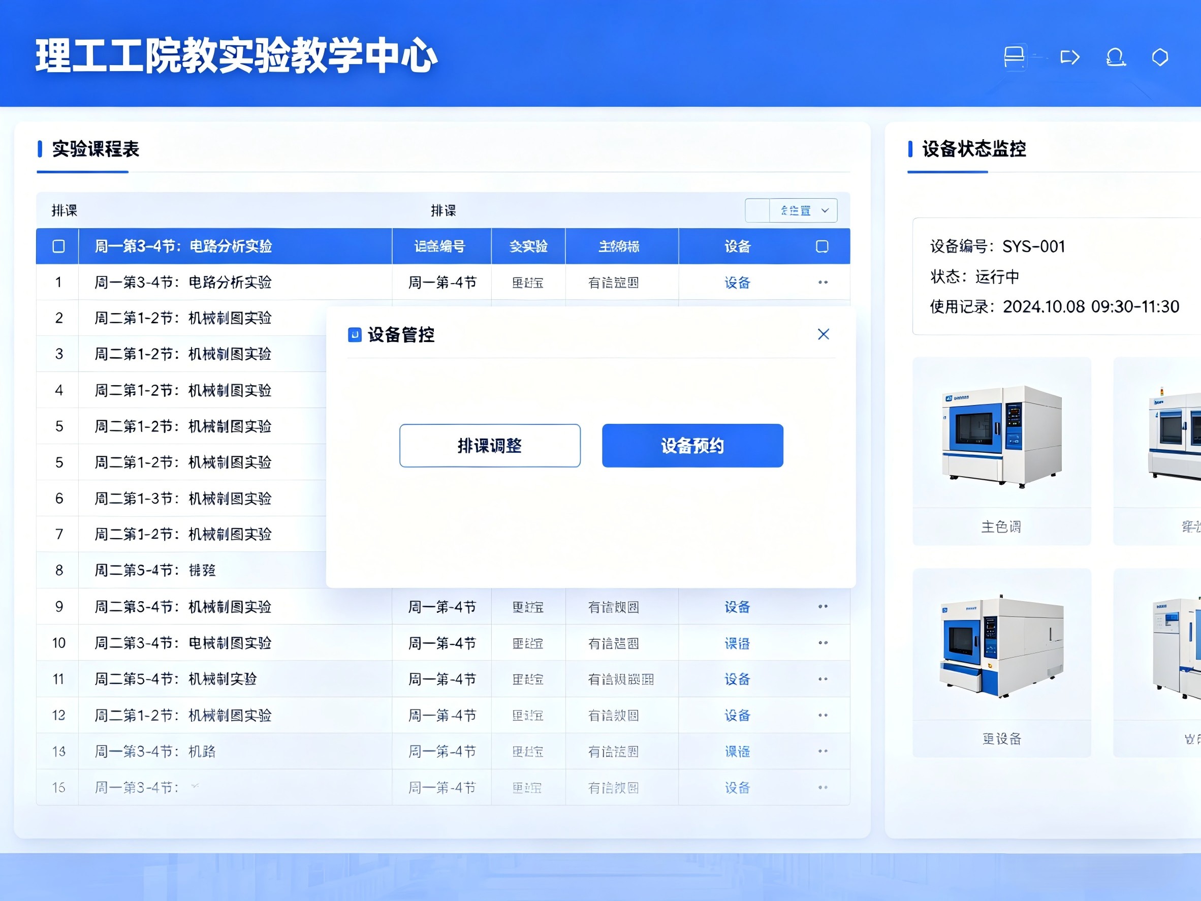 课程库、实验项目库、智能排课、冲突检测 耗材精准库存、货位管理、实时查询 设备共享预约、人脸识别门禁、智能计费
